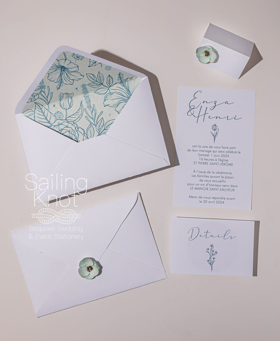 For a love story as exquisite as nature's finest blooms. This ethereal invitation suite features delicate botanical illustrations in shades of turquoise on a crisp white background. The RSVP card echoes the elegant design, completing a timeless and sophisticated invitation experience.